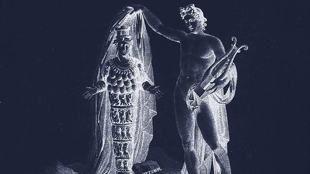 The statue is obviously unveiled by Apollo, the god of poetry, and she is a representation of the goddess Nature, who had emerged from a fusion between the figure of Artemis of Ephesus and that of Isis, who, according to an ancient inscription reported by Plutarch, said, “No mortal has raised my veil.”
